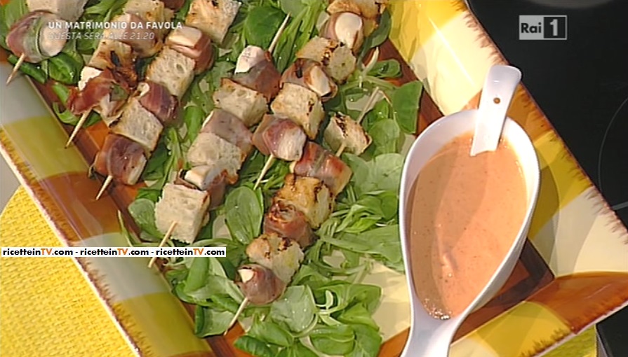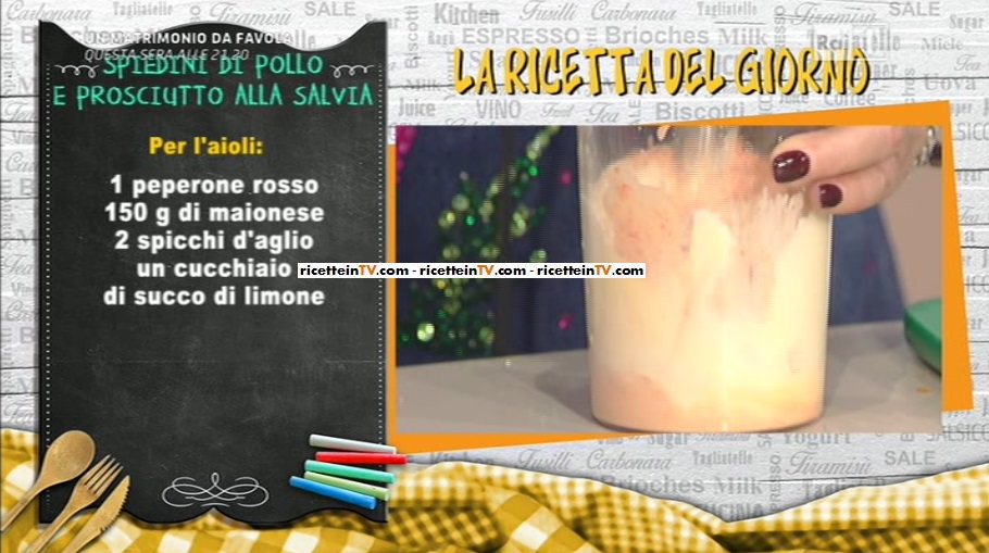 Mettiamo a marinare il pollo a tocchetti in una miscela di olio, succo di limone, sale, pepe e dell’aglio. Anna consiglia di bagnare gli stecchi di legno con cui infilzeremo la carne. Intanto, tagliamo a cubettoni il pane; sul prosciutto affettato (tagliamo una fetta a metà), mettiamo una foglia di salvia ed un tocchetto di pollo; arrotoliamo ed infilziamo il bocconcino ottenuto con lo stecco di legno umido, alternando a dei cubetti di pane. Cuociamo gli spiedini sulla griglia o su una bistecchiera fin quando appaiono ben dorati su tutti i lati. Per la salsa, dobbiamo arrostire i peperoni e pelarli; li trasferiamo in un bicchiere da mixer insieme alla maionese, l’aglio ed il succo di limone; frulliamo con un mixer ad immersione fino ad ottenere una crema vellutata.
