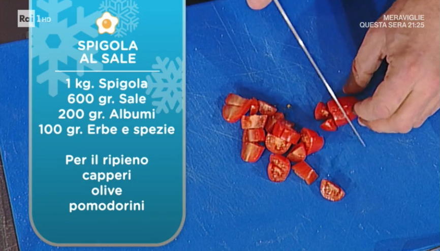 • 1 Kg Spigola, 600 g sale, 200 g albumi, 100 g erbe e spezie