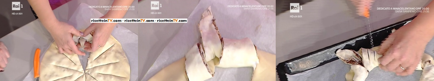 Cominciamo dal centro, incidiamo con un taglia pizza in modo da ottenere 7 dischi. All’interno dei 7 spicchi, pratichiamo (al centro) delle altre incisioni, stando lontani dai bordi. Quindi, arrotoliamo ogni spicchio su se stesso: inseriamo la punta dentro la seconda fessura ed adagiamo sul bordo esterno. Diamo al cerchio ottenuto la forma di una stella. Incidiamo superficialmente la sfoglia. Spennelliamo con l’uovo sbattuto e spolveriamo con dello zucchero semolato. Inforniamo a 180° per 45 minuti.