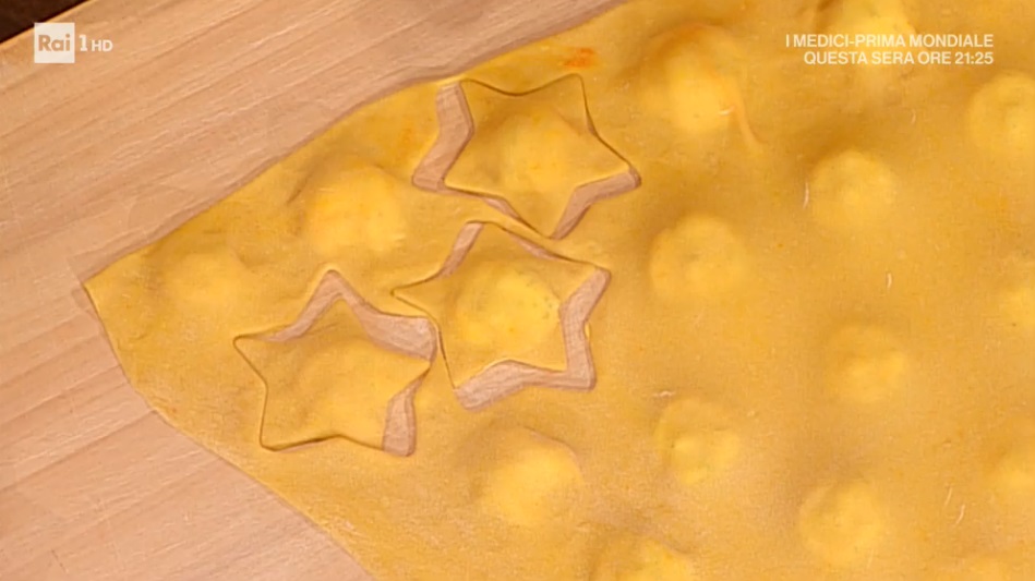 Su metà sfoglia, formiamo delle noci di ripieno ai formaggi. Copriamo con l’altra metà della sfoglia e sigilliamo all’interno il ripieno, facendo uscire tutta l’aria. Ritagliamo le stelle con l’apposito stampino. Cuociamo in acqua bollente e salata per un paio di minuti circa: devono gonfiarsi.