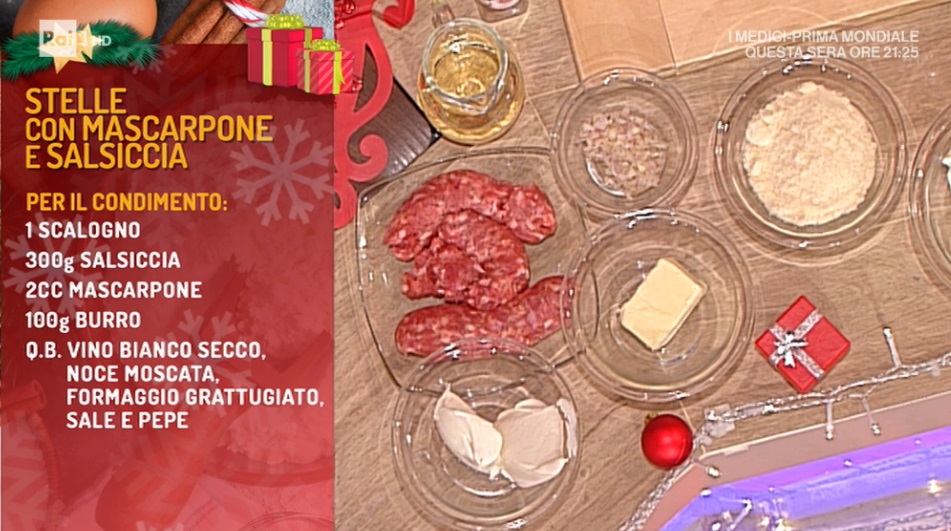 - Condimento: 1 scalogno, 300 g salsiccia, 2 cc mascarpone, 100 g burro, vino bianco, noce moscata, formaggio grattugiato, sale e pepe