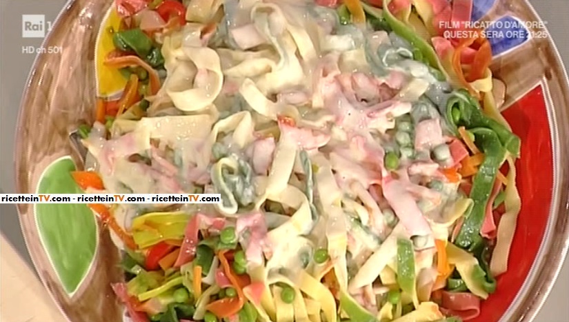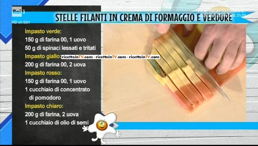 Prepariamo la pasta all’uovo, impastando separatamente gli ingredienti sopra indicati. Attacchiamo i panetti variopinti, alternando rosso, giallo, verde, giallo chiaro e ancora rosso. Stendiamo il panetto variopinto. Una volta stesa, la facciamo asciugare un po’ all’aria. Quindi, pieghiamo e ritagliamo le tagliatelle.