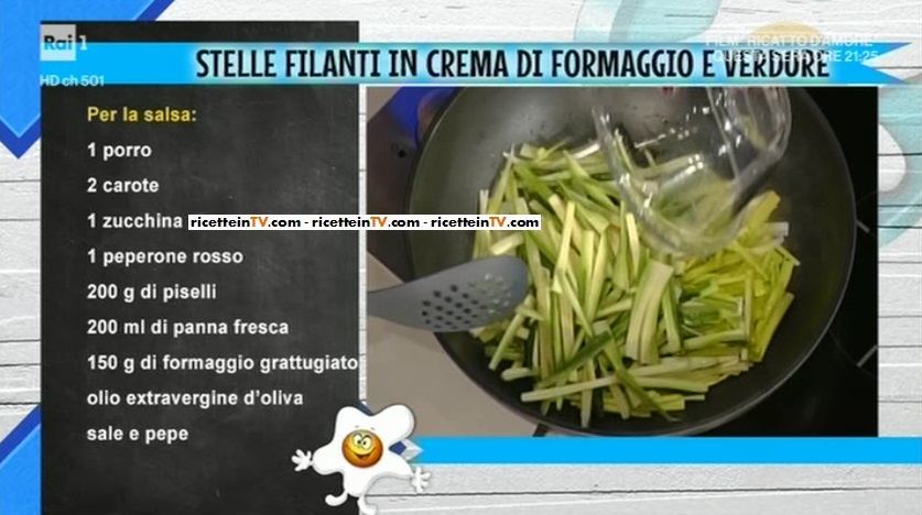 Per il condimento, in padella, con un generoso filo d’olio, facciamo rosolare il porro tagliato a listarelle. Successivamente, aggiungiamo le zucchine ed i peperoni, anch’essi a listarelle. Intanto, scottiamo nell’acqua della pasta, quindi bollente e salata, le carote a listarelle ed i piselli. Dopo qualche minuto, le aggiungiamo alle altre verdure.