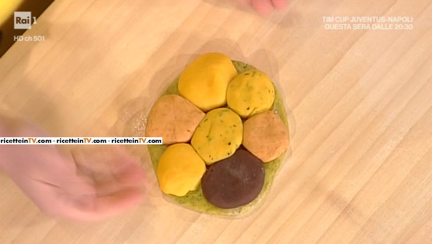 Prepariamo i diversi impasti colorati: si tratta di pasta all’uovo, a cui si aggiunge del cacao (per il nero), degli spinaci lessi e tritati (per il verde) e del concentrato di pomodoro (per il rosso). Stendiamo il primo panetto, quello verde, lasciandolo spesso circa 2 cm. Sopra, disponiamo delle palline di impasto di vari colori, pressando leggermente, devono attaccarsi per bene. Lasciamo riposare, coperto, per almeno 10 minuti.