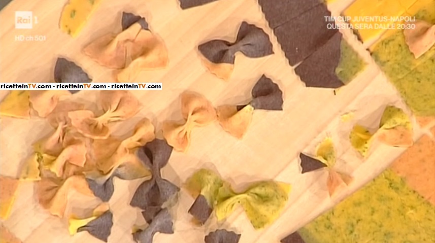 Stendiamo la sfoglia. Otterremo l’effetto arlecchino. Tagliamo a rettangolini e formiamo gli strichetti, ovvero le più conosciute farfalle, pizzicando ogni rettangolo al centro. Lessiamo in acqua salata.