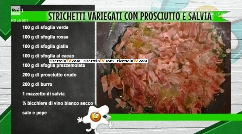 - 100 g sfoglia verde, 100 g sfoglia rossa, 100 g sfoglia gialla, 100 g sfoglia al cacao, 100 g sfoglia prezzemolata, 200 g prosciutto crudo, 200 g burro, 1 mazzetto di salvia, 1/2 bicchiere di vino bianco secco, sale e pepe