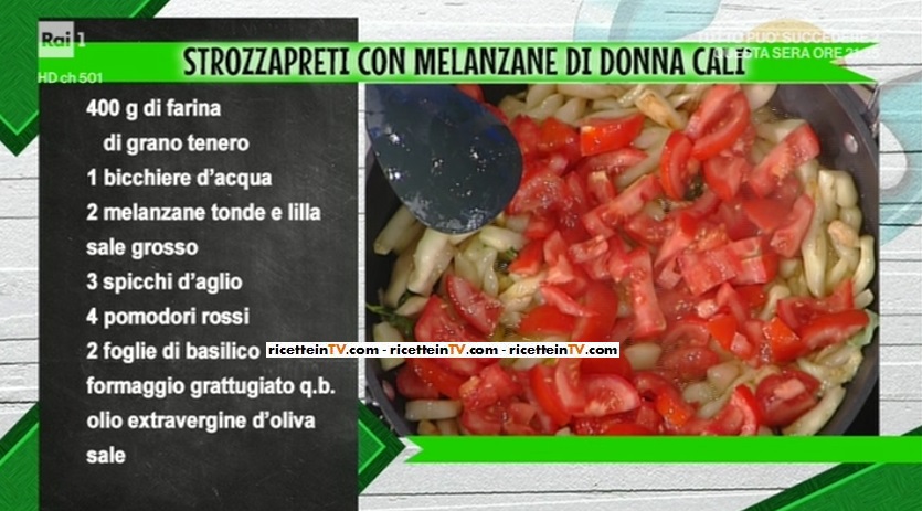 Ultimo epico scontro tra Annina Moroni e Alessandra Spisni. Ciascuno propone la ricetta dell’estate. Per Anna, i mitici pomodori col riso. Alessandra replica con un piatto della compianta suocera siciliana, strozzapreti con melanzane di Donna Calì.