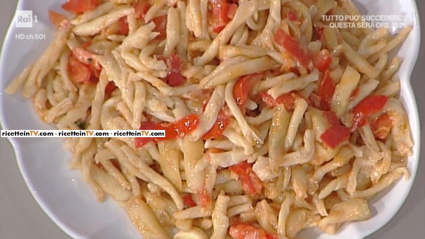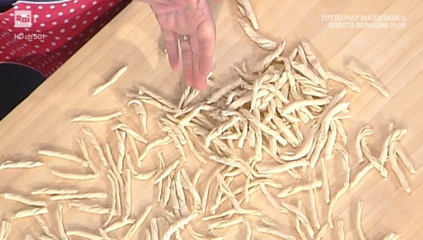 Intanto, prepariamo gli strozzapreti. Impastiamo la farina con l’acqua per qualche minuto, fino ad ottenere un composto liscio ed elastico. Lasciamo riposare, coperto, per 30 minuti. Stendiamo una sfoglia sottile. Tagliamo a striscioline e le arrotoliamo tra le mani, in modo da formare gli strozzapreti. Tuffiamo in acqua salata e quando vengono a galla li scoliamo.