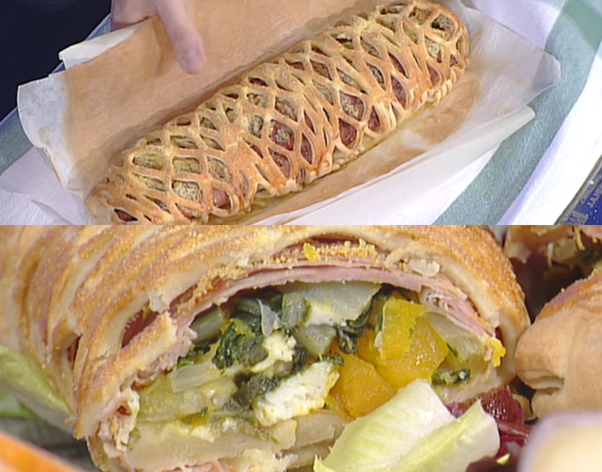 Apriamo un rotolo di pasta brisè, la infariniamo leggermente, quindi la capovolgiamo, la incidiamo con un rullo a rete ed apriamo leggermente i tagli per ottenere una rete (è facoltativo). Farciamo mettendo sopra il prosciutto cotto a fette ed il composto di verdure e formaggella. Arrotoliamo, formando uno strudel. Facoltativamente spennelliamo con un uovo sbattuto e spolveriamo con farina di polenta. Inforniamo per 30/35 minuti a 180°. Serviamo su un letto di misticanza. Buon appetito.