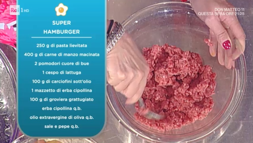 - 250 g pasta lievitata, 400 g carne di manzo macinata, 2 pomodori cuore di bue, 1 cespo di lattuga, 100 g carciofini sott’olio, 1 mazzetto di erba cipollina, 100 g groviera grattugiato, erba cipollina, olio evo, sale e pepe
