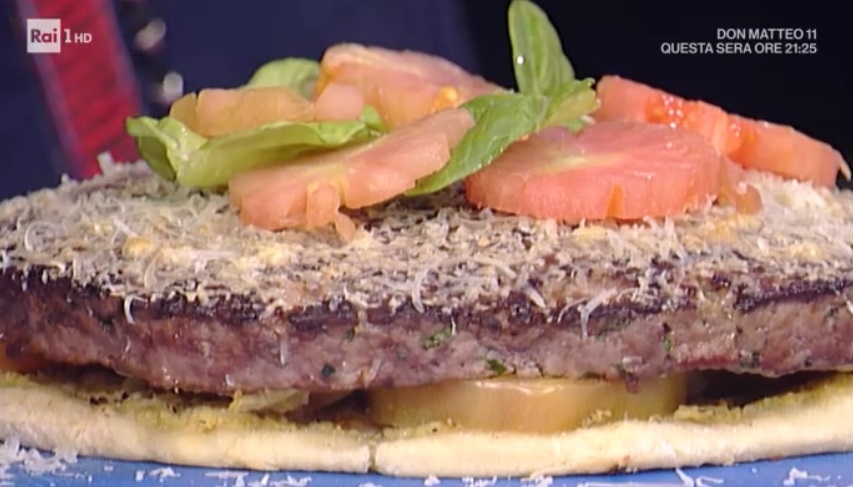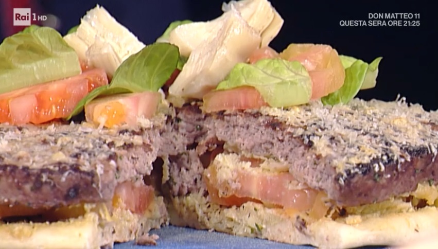 Scaldiamo una padella unta d’olio. Mettiamo all’interno il nostro maxi hamburger, aiutandoci con la carta forno. Quando in superficie comincia a cambiare colore, lo giriamo, come fosse una frittata (aiutatevi con un piatto o la base della teglia a cerniera). Dev’essere dorata su entrambi i lati.