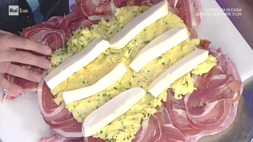 A parte, schiacciamo le patate lesse e le condiamo con formaggio grattugiato, un uovo, la scorza di limone grattugiata e l’erba cipollina tritata (o prezzemolo). Aggiustiamo di sale e pepe. Mescoliamo per bene e stendiamo il composto sullo strato di coppa. Disponiamo sulle patate la mozzarella (per pizza) a listarelle. Richiudiamo la carne sul ripieno. Avvolgiamo la tacchinella con la rete di maiale.