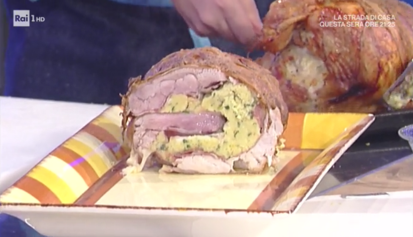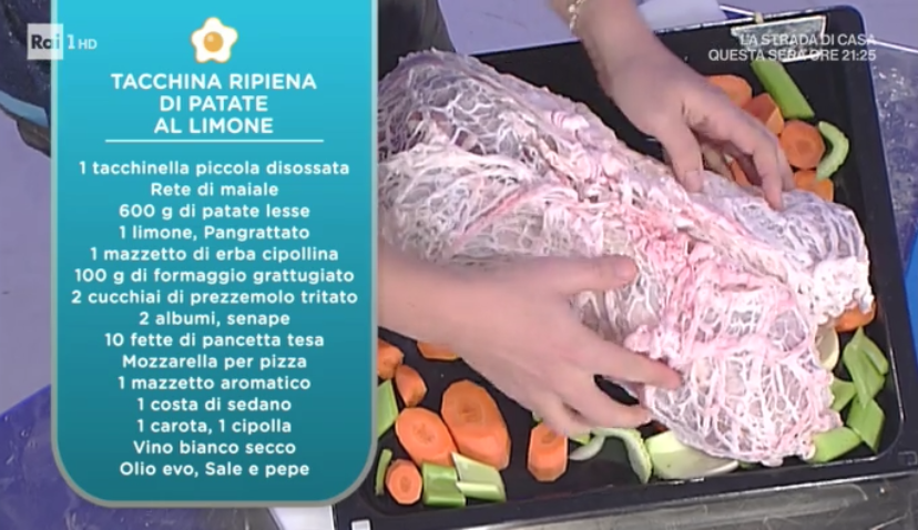 - 1 tacchinella piccola disossata, rete di maiale, 600 g patate lesse, 1 limone, pangrattato, 1 mazzetto di erba cipollina, 100 g formaggio grattugiato, 2 cucchiai di prezzemolo tritato, 2 albumi, senape, 10 fette di pancetta tesa, mozzarella per pizza, 1 mazzetto aromatico, 1 costa di sedano, 1 carota, 1 cipolla, vino bianco, olio evo, sale e pepe