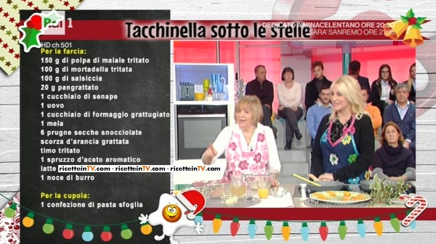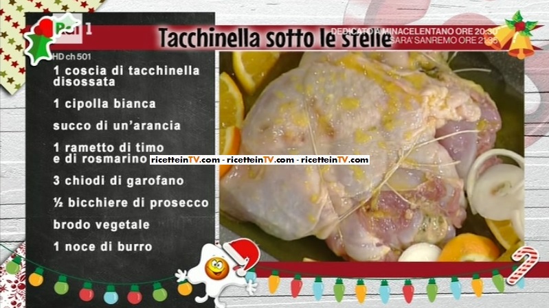 Anna Moroni, oggi, pensa al secondo piatto. Anche in questo caso, una portata sontuosa e ricchissima. Il procedimento è un po’ lungo, avverte Anna, ma ne vale la pena. Prepariamo la tacchinella sotto le stelle.