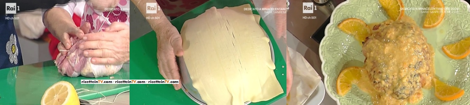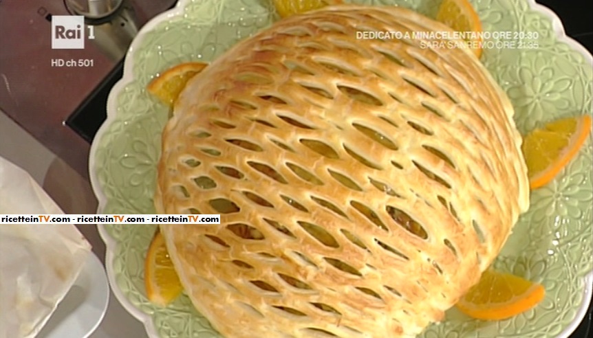 Per la cupola: prendiamo la pasta sfoglia e, con l’apposito attrezzo, formiamo una rete. Prendiamo una teglia a cupola, che capovolgiamo. Mettiamo sopra la sfoglia, la spennelliamo con l’uovo intero ed inforniamo a 220° per 10 minuti. Si allarghera e diventerà un’ottina cupola. Glassiamo la tacchinella con il fondo di cottura frullato e mettiamo sopra la cupola di sfoglia.