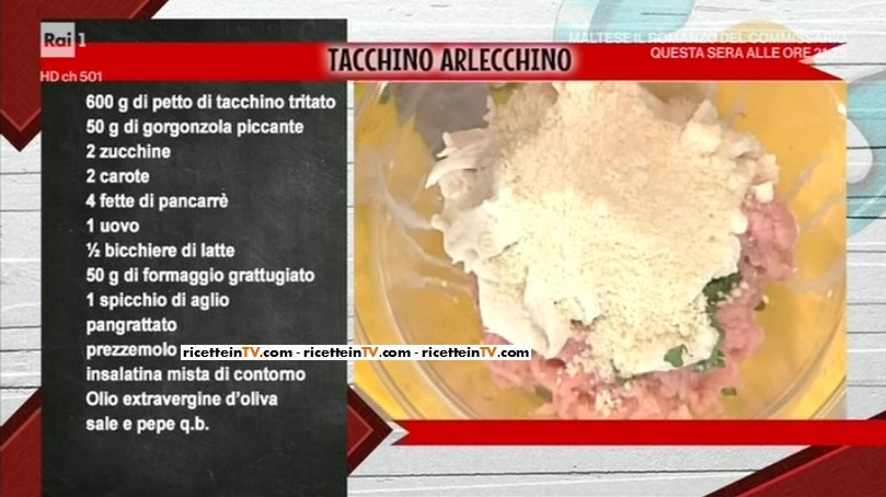 - 600 g petto di tacchino tritato, 50 g gorgonzola piccante, 2 zucchine, 2 carote, 4 fette di pancarrè, 1 uovo, 1/2 bicchiere di latte, 50 g formaggio grattugiato, 1 spicchio di aglio, pangrattato, prezzemolo, insalatina mista, olio evo, sale e pepe