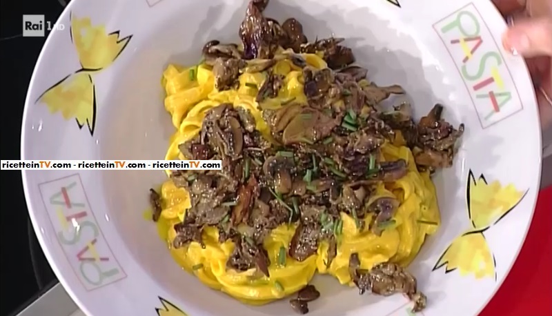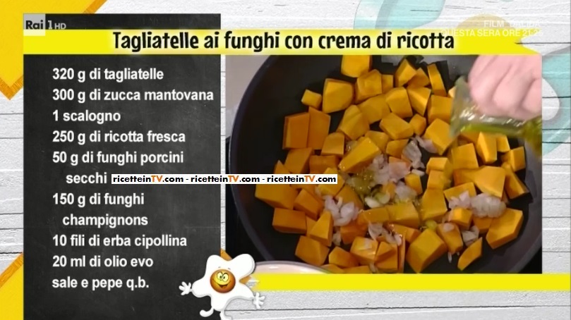 - 320 g di tagliatelle, 300 g di zucca mantovana, 1 scalogno, 250 g di ricotta fresca, 50 g di funghi porcini secchi, 150 g di champignons, 10 fili di erba cipollina, 20 ml di olio evo, sale e pepe qb