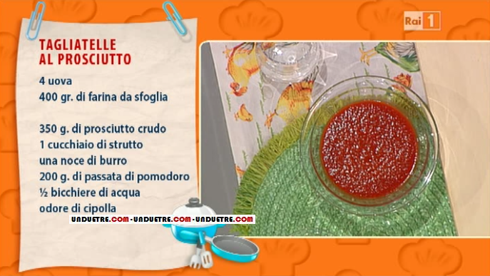Vi proponiamo una gustosa ricetta realizzata in una delle ultime edizioni de La prova del cuoco.Ed ora è il momento di ballare sulle note di una passionale mazurka, oltre che di cucinare con la brava, la simpatica e sempre allegra Alessandra Spisni. Oggi  Alessandra prepara le tagliatelle al prosciutto, quindi iniziamo dagli ingredienti.