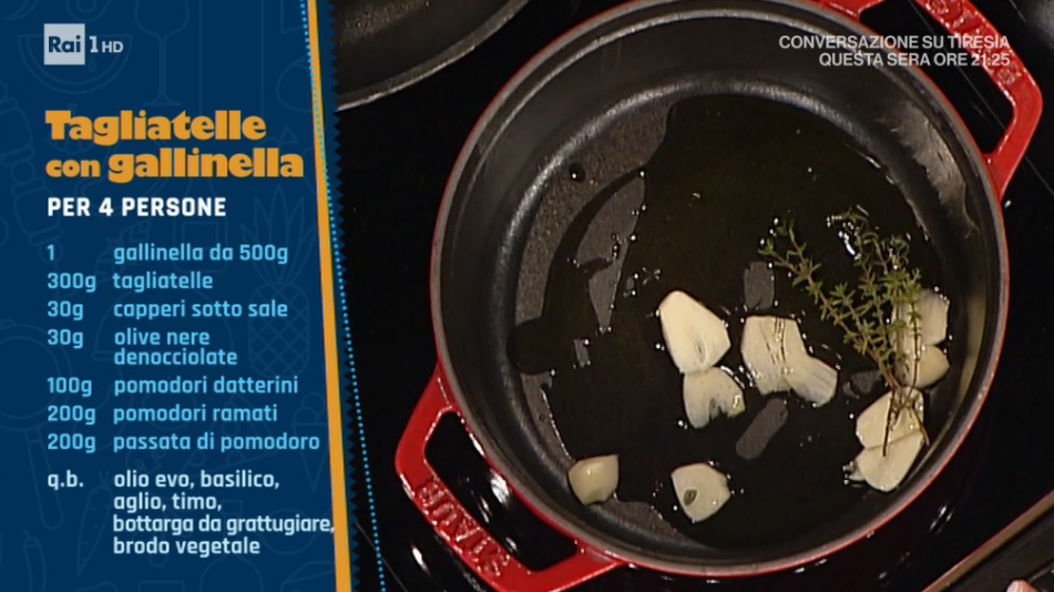 - 1 gallinella da 500 g, 300 g tagliatelle, 30 g capperi sotto sale, 30 g olive nere, 100 g pomodori datterini, 200 g pomodori ramati, 200 g passata di pomodoro, olio, basilico, aglio, timo, bottarga, brodo vegetale