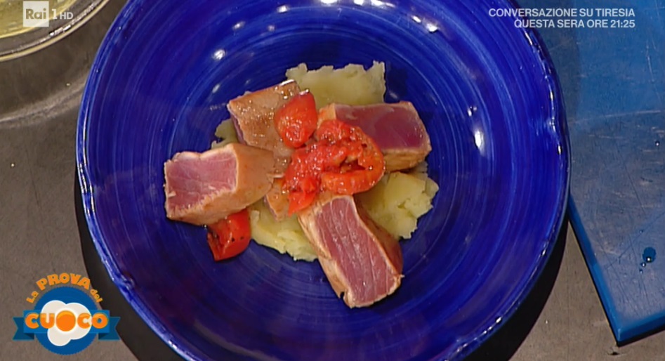 Infine, in un pentolino facciamo cuocere i pomodori con olio, aglio, capperi, origano e peperoncino. Serviamo il tonno sulle patate, con i pomodori.