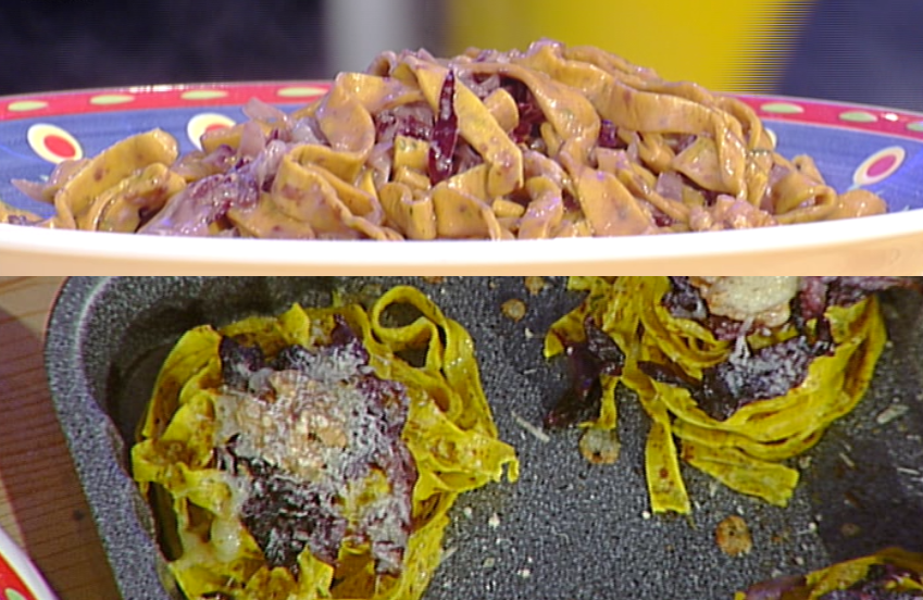Facciamo il sugo: in una padella antiaderente sciogliamo un pezzetto di burro, uniamo a soffriggere lo scalogno tagliato finemente, poi aggiungiamo il radicchio pulito e tagliato a listarelle e lo facciamo stufare. Sfumiamo con del vino rosso. Uniamo i gherigli di noci. Scoliamo le tagliatelle nel sugo. Impiattiamo e spolveriamo con formaggio e scamorza grattugiati.