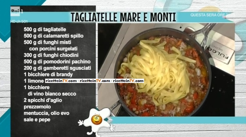 - 500 g tagliatelle, 500 g calamaretti, 500 g funghi misti con porcini surgelati, 300 g funghi chiodini, 500 g pomodorini pachino, 200 g gamberetti sgusciati, 1 bicchiere di brandy, 1 limone, 1 bicchiere di vino bianco secco, 2 spicchi d’aglio, prezzemolo, mentuccia, olio evo, sale e pepe