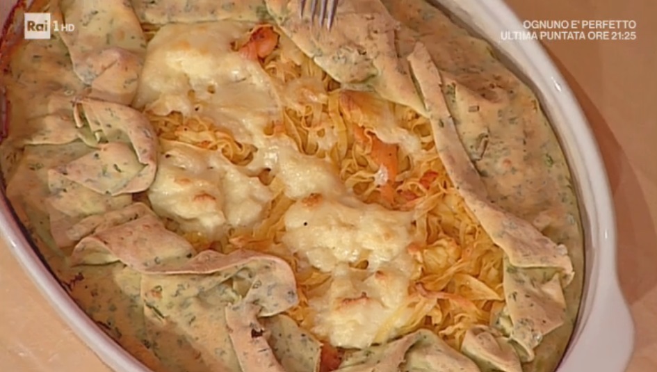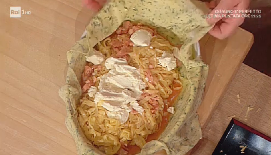 Scoliamo le taglioline direttamente nel condimento e mescoliamo. Versiamo i tagliolini all’interno nel guscio di sfoglia prezzemolata e distribuiamo sopra il mascarpone. Ripieghiamo i bordi della sfoglia sui tagliolini e cuociamo in forno caldo e statico a 180° per 15 minuti.
