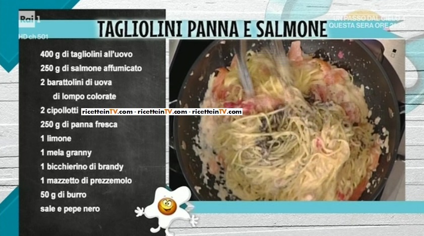 - 400 g tagliolini, 250 g salmone affumicato, 2 barattolini di uova di lompo colorate, 2 cipollotti, 250 g panna fresca, 1 limone, 1 mela granny, 1 bicchierino di brandy, 1 mazzetto di prezzemolo, 50 g burro, sale e pepe