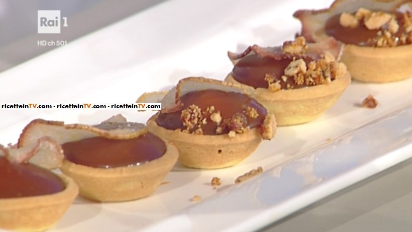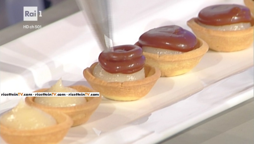 Per la crema di pere, frulliamo le pere in purezza, con succo di limone, oppure compriamo della polpa di pera non zuccherata (succhi di frutta 100%). Mettiamo in un pentolino con lo zucchero ed i semi di un baccello di vaniglia. Portiamo a bollore. A parte, si scioglie l’amido di mais con il latte. Inseriamo alla polpa di pere bollente e mescoliamo velocemente. Trasferiamo in un contenitore. Copriamo con pellicola a contatto. Lasciamo raffreddare. Quindi, farciamo le tartellette con la crema alle pere. Copriamo con il mou e decoriamo con pere essiccate e arachidi tostate e salate in granella.