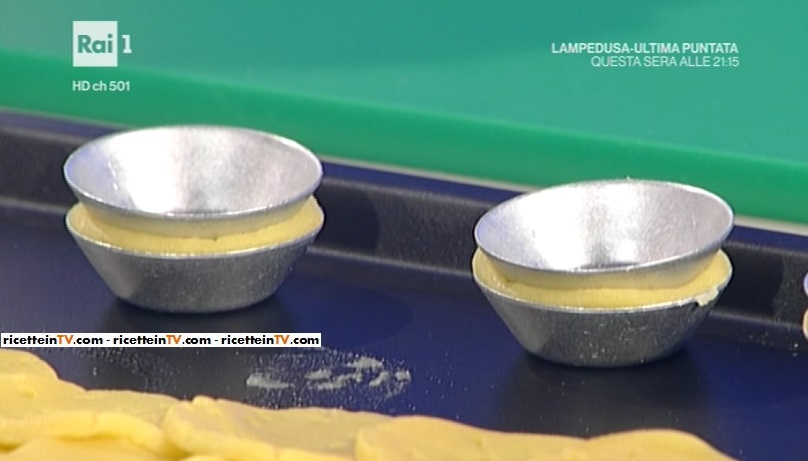 Ricaviamo dei dischetti di frolla. Li bucherelliamo e foderiamo gli appositi stampini per tartellette. Mettiamo sopra un altro stampino, in modo che la frolla non gonfi in cottura. Inforniamo a 180°, statico, per 10 minuti circa. Dev’essere dorata.