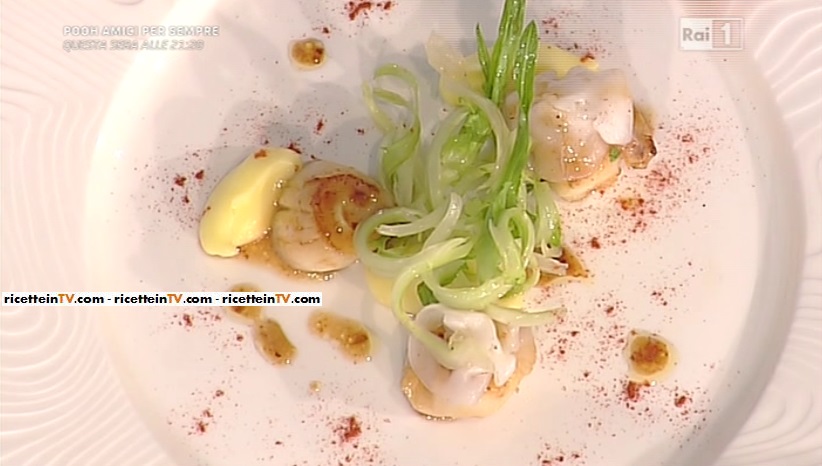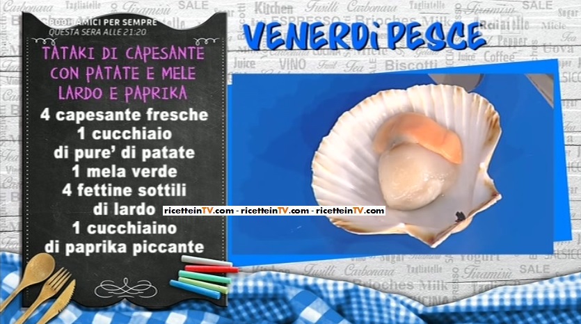 Venerdì pesce, con Gianfranco Pascucci, che dopo aver commentato le abitudini notturne di Gianfranco Pascucci, prepara uno dei suoi raffinatissimi piatti. Ecco la ricetta del tataki di capesante con patate e mele lardo e paprika.