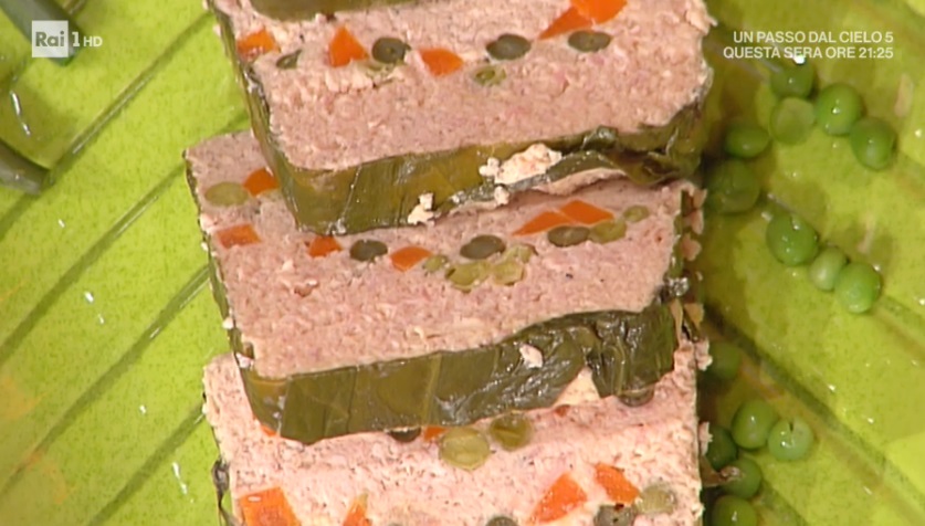 Formiamo sulla base della terrina foderata con la bieta uno strato di composto (1/3 del totale). Disponiamo sopra i fagiolini precedentemente lessati e copriamo con un altro strato di composto. Proseguiamo con le carote lesse a rondelle, ancora uno strato di pollo e tacchino, i pisellini saltati in padella e finiamo con il composto di carne. Copriamo con le foglie di bieta disposte sui bordi. Posizioniamo la teglia all’interno di un’altra teglia con dell’acqua. Mettiamo in forno preriscaldato a 200° per 30 minuti.