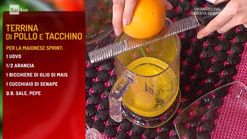 Per la maionese sprint, mettiamo nel bicchiere del frullatore ad immersione un uovo intero, un bicchiere di olio di mais, il succo di metà arancia, un cucchiaio di senape, sale e pepe. Frulliamo ad immersione fino ad ottenere la consistenza desiderata.