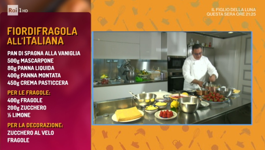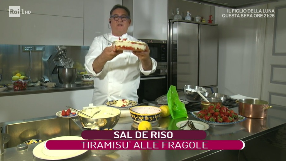 Sal De Riso, in collegamento dalla sua casa, affacciato direttamente sul mare di Minori, prepara un dessert golosissimo, a base di fragole, amatissimo frutto di stagione. Ecco il tiramisù alle fragole.