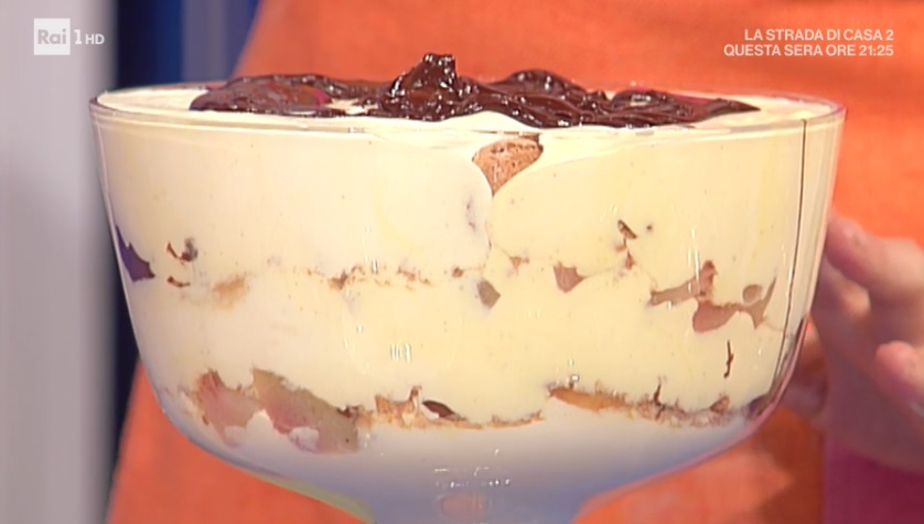 - 10 tuorli (300 g), 300 g zucchero, 100 ml acqua, 500 g mascarpone. 500 ml panna fresca, 4 pesche a pasta bianca, 200 g cioccolato fondente, 70 g amaretti, 1 bacca di vaniglia, vino bianco