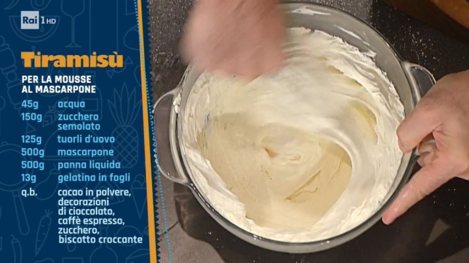 - Mousse al mascarpone: 45 g acqua, 150 g zucchero semolato, 125 g tuorli d’uovo, 500 g mascarpone, 500 g panna liquida, 13 g gelatina in fogli
