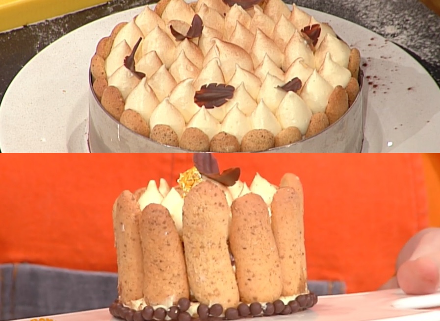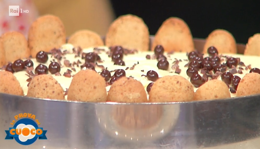 Componiamo: all’interno di un anello, adagiamo un primo strato di croccante al caffè e cioccolato o semplicemente savoiardi. Ai lati, mettiamo i savoiardi, in modo da formare una corona. Formiamo sopra il croccante (o savoiardi) uno strato di mousse al mascarpone. Spolveriamo con delle perline di cioccolato o del cioccolato tritato. Copriamo con il savoiardo imbevuto di caffè. Copriamo con altra crema e ancora savoiardo imbevuto e continuiamo così fino ad arrivare al bordo. Finiamo con spuntoni di mousse ed una spolverata di cacao amaro in polvere. Lasciamo riposare in frigorifero, quindi eliminiamo l’anello e decoriamo a piacere.