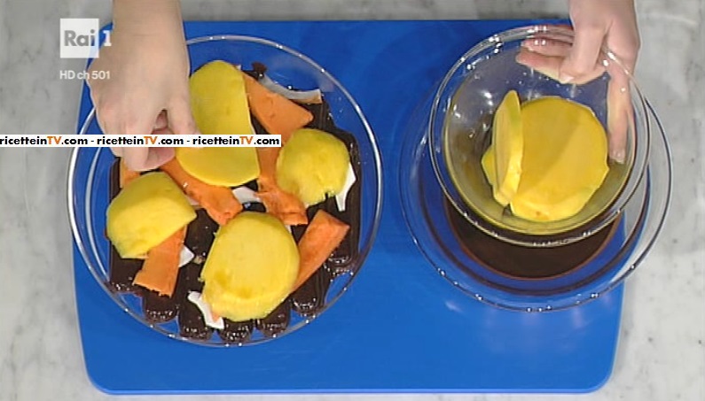 Immergiamo i savoiardi nella salsa al cioccolato e li disponiamo alla base di una pirofila. Disponiamo sopra il cocco, la papaya, il mango ed il frutto della passione. Copriamo con la crema al mascarpone. Decoriamo con poca frutta tenuta da parte e scaglie di cioccolato fondente (80 g in totale).