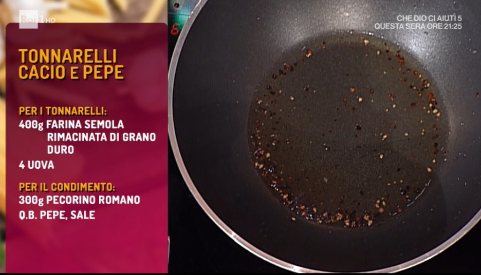 In una padella, scaldiamo il pepe nero macinato. Dopo qualche istante, aggiungiamo un mestolo di acqua di cottura della pasta. Scoliamo i tonnarelli direttamente in padella, con il pepe. Saltiamo per qualche istante, in modo da risottare la pasta, aggiungendo poca acqua di cottura quando serve. Aggiungiamo il pecorino grattugiato e saltiamo ancora, aggiungendo poca acqua se serve: dobbiamo ottenere una crema.