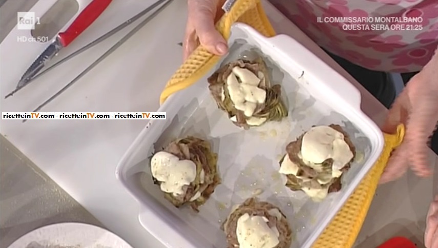 In una pirofila, formiamo delle torrette: iniziamo con il carpaccio, mettiamo sopra una fettina di carciofo, un po’ di stracchino, ancora carpaccio, carciofo e stracchino ed un ultimo strato. Finiamo con una fetta di stracchino. Inforniamo per qualche minuto in forno, in modo da far sciogliere per bene lo stracchino.