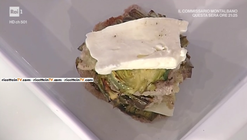 Per prima cosa puliamo i carciofi e li tuffiamo in acqua e limone. Dopo qualche minuto, tagliamo i carciofi a fettine spesse e li cuociamo sulla griglia rovente con olio e sale.