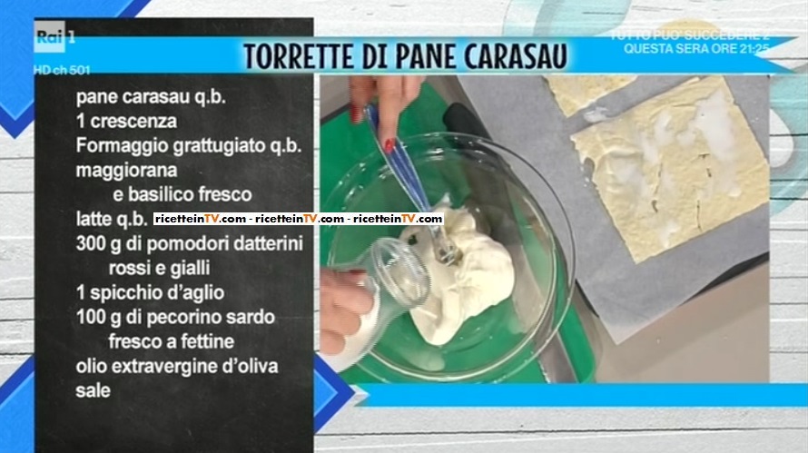 - pane carasau, 1 crescenza, formaggio grattugiato, maggiorana, basilico fresco, latte, 300 g pomodori datterini rossi e gialli, 1 spicchio d’aglio, 100 g pecorino sardo a fettine, olio evo, sale