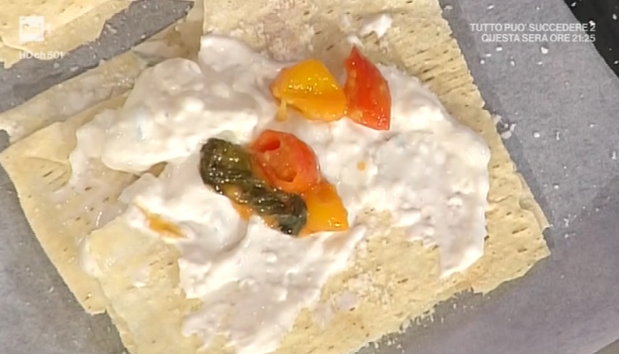 Ricaviamo dei quadratoni dal pane carasau, come fossero delle sfoglie di pasta all’uovo per lasagne. Mettiamo delle sfoglie su un foglio di carta forno e le bagniamo leggermente con poco latte. A parte, mescoliamo la crescenza con poco latte, in modo da ammorbidirla, maggiorana, basilico, sale e pepe. Spalmiamo una generosa cucchiaiata di crescenza sulle sfoglie ammorbidite. Profumiamo con altro basilico e mettiamo sopra qualche pomodorino saltato. Spolveriamo con formaggio grattugiato e copriamo con un’altra sfoglia di pane. Bagniamo nuovamente con del latte e continuiamo con crescenza, pomodori, formaggio e basilico.