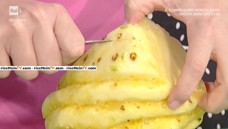 Sbucciamo l’ananas e la priviamo degli ‘occhietti’, ovvero la parte dura (basta intagliare l’ananas in diagonale, come nella foto). Un terzo la tagliamo a cubetti piccoli. Il resto, invece, la tagliamo a fettine spesse 2-3 mm circa.