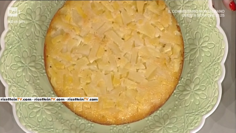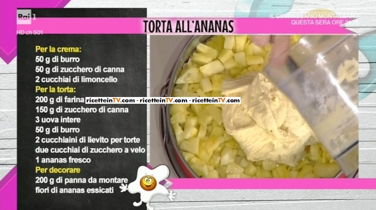 - Per la torta: 200 g farina, 150 g zucchero di canna, 3 uova intere, 50 g burro, 2 cucchiai di lievito per torte, due cucchiai di zucchero a velo, 1 ananas fresco