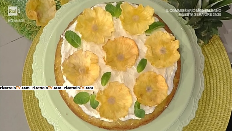 Disponiamo i cubetti di ananas alla base della tortiera (sulla crema di burro e zucchero). Copriamo con l’impasto della torta. Inforniamo per 40-45 minuti a 170°, ventilato. Oppure, statico per 50 minuti. Quando la sforniamo, facciamo raffreddare e la capovolgiamo. Spalmiamo con panna fresca montata e decoriamo con i fiori d’ananas.