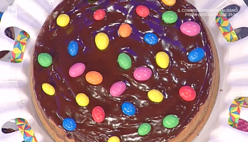 Per la glassa, sciogliamo a bagnomaria il cioccolato con la panna. Versiamo sulla torta e decoriamo con le caramelline.