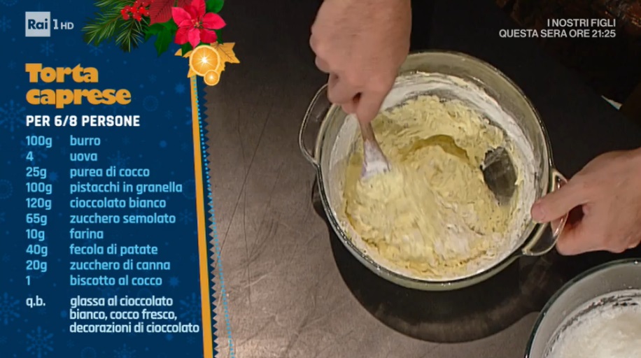 A chiudere il menu di oggi è il dolce del pasticcere Federico Prodon. L’ex concorrente di Bake Off Italia prepara un classico della pasticceria partenopea, la torta caprese.