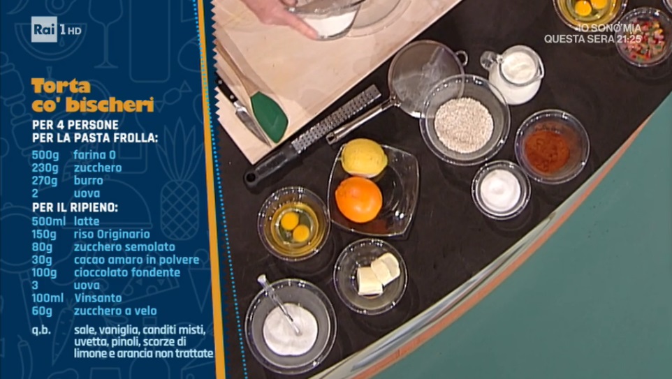 - Ripieno: 500 ml latte, 150 g riso Originario, 80 g zucchero semolato, 30 g cacao amaro in polvere, 100 g cioccolato fondente, 3 uova, 100 ml vinsanto, canditi misti, uvetta, pinoli, scorze di agrumi, vaniglia, 60 g zucchero a velo