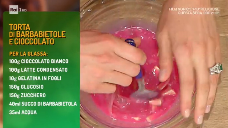Per la glassa, mettiamo in un pentolino lo zucchero con il glucosio, il latte condensato ed il succo della barbabietola. Portiamo a bollore, quindi versiamo sul cioccolato bianco tritato e mescoliamo fino a scioglierlo completamente. Uniamo la gelatina reidratata in acqua e sgocciolata. Mescoliamo fino a scioglierla.